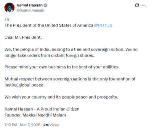 कमल हासन ने आधिकारिक X अकाउंट (पहले ट्वविटर) से लिखा है, ‘सेवा में, अमेरिका के राष्ट्रपति डोनाल्ड ट्रम्प। माननीय राष्ट्रपति जी, हम भारत के लोग एक आजाद और अपने फैसले खुद लेने वाले देश के नागरिक हैं। अब हम किसी दूसरे देश से ऑर्डर नहीं लेते। कृपया अपने काम से काम रखें। देशों के बीच आपसी सम्मान ही दुनिया में शांति बनाए रखने का सही तरीका है। हम आपके देश और वहां के लोगों के लिए शांति और तरक्की की कामना करते हैं। कमल हासन- एक प्राउड भारतीय नागरिक। संस्थापक- मक्कल नीधि माइअम।’