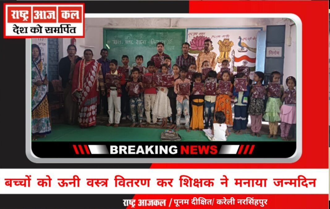 राष्ट्र आजकल/ पूनम दीक्षित/ करेली नरसिंहपुर / दिनांक 24 दिसंबर 2022 दिन शनिवार को ग्राम तिंसरा के शासकीय प्राथमिक शाला स्कूल में श्रीमति सुरेखा( शिक्षिका) आशीष फौजदार ( शिक्षक) ने अपने जन्मदिवस के शुभ अवसर पर प्राथमिक शाला के छात्र छात्राओं को ग्राम के सरपंच महोदय श्री प्रशांत कौरव, एवं ग्राम के युवा नागरिक आनंद फौजदार, राममिलन कौरव, सोमित पाली , मंसाराम झारिया (ग्राम कोटवार ) एवं शाला की प्रधान पाठिका, शिक्षिका की उपस्थिति में बच्चों को ऊनी कपड़े ( बनियान) वितरण कर मनाया जन्मदिन।