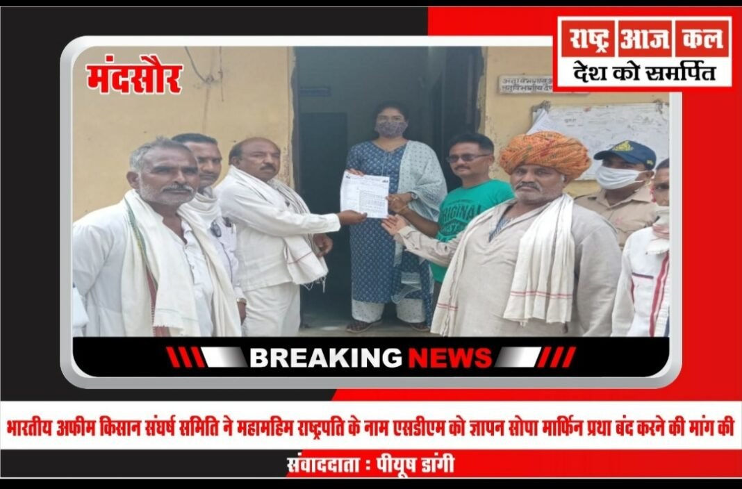 राष्ट्र आजकल/पीयूष डांगी/मंदसौर/भारतीय अफीम किसान संघर्ष समिति ने महामहिम राष्ट्रपति के नाम एसडीएम को ज्ञापन सोप मार्फिन प्रथा बंद करने की मांग की