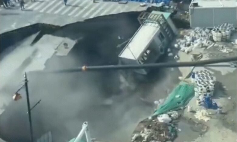 चीन के शंघाई में एक व्यस्त सड़क अचानक धंस गई और 10 से 20 मीटर चौड़ा गड्ढा बन गया। घटना मिनहांग डिस्ट्रिक्ट के किक्सिन रोड के पास हुई, जिसका वीडियो CCTV में कैद हो गया।