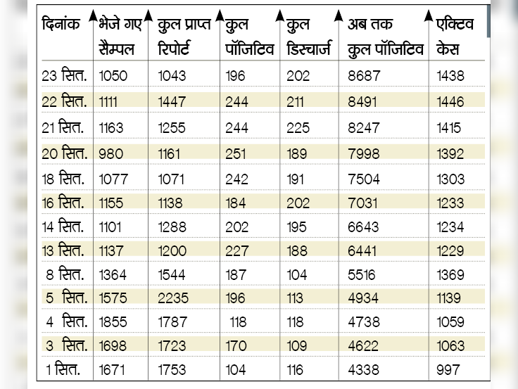 आँकड़ों की कहानी की शुरूआत 23 सितम्बर से ही करते हैं। पिछले 24 घंटों में 1050 सैम्पल भेजे गए और 1043 सैम्पलों की रिपोर्ट आई, जिसमें से 196 पॉजिटिव पाए गए और इसी दिन 202 लोगों को स्वस्थ होने पर डिस्चार्ज किया गया।