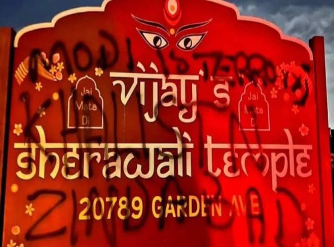 राष्ट्र आजकल प्रतिनिधि I अमेरिका के कैलिफोर्निया में एक बार फिर से हिंदू मंदिर पर हमला हुआ है। कैलिफोर्निया के हेवर्ड में मौजूद विजय शेरावाली मंदिर में खालिस्तानी समर्थकों ने भारत विरोधी बातें लिखीं। खालिस्तानियों ने मंदिर की दीवार पर प्रधानमंत्री नरेंद्र मोदी के बारे में भी अपशब्द लिखे हैं। साथ ही खालिस्तान जिंदाबाद जैसे नारे भी लिखे नजर आए।