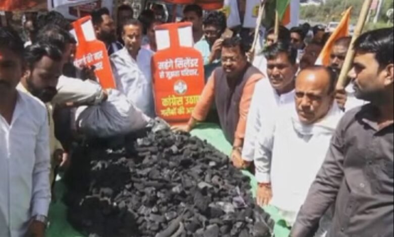 LPG संकट के विरोध में कांग्रेसियों ने किया भोपाल में किया अनूठा विरोध-प्रदर्शन; दुकानदारों को फ्री बांटा कोयला