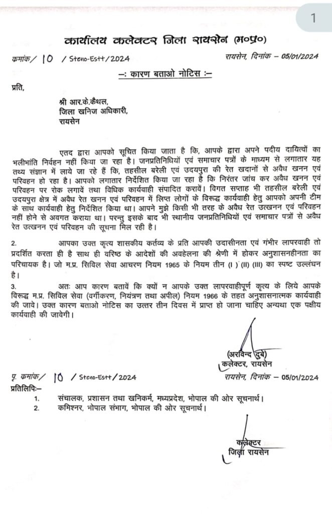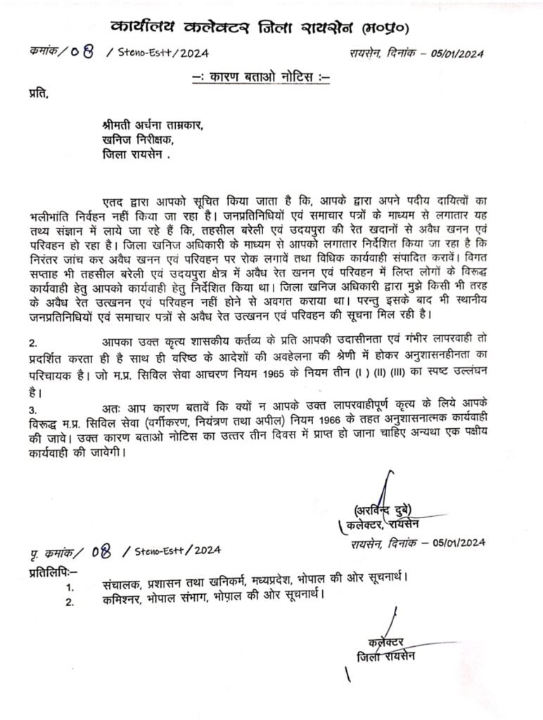 कलेक्टर श्री दुबे द्वारा जिला खनिज अधिकारी श्री आरके कैथल, सहायक खनिज अधिकारी श्री सुमित गुप्ता तथा खनिज निरीक्षक श्रीमती अर्चना ताम्रकार को पदीय दायित्वों का भलीभांति निर्वहन नहीं करने तथा लापरवाही बरतने पर कारण बताओ नोटिस जारी करते हुए तीन दिवस में उत्तर देने के निर्देश दिए गए हैं। निर्धारित अवधि में उत्तर नहीं देने या उत्तर संतोषजनक नहीं होने पर एक पक्षीय कार्यवाही की जाएगी।