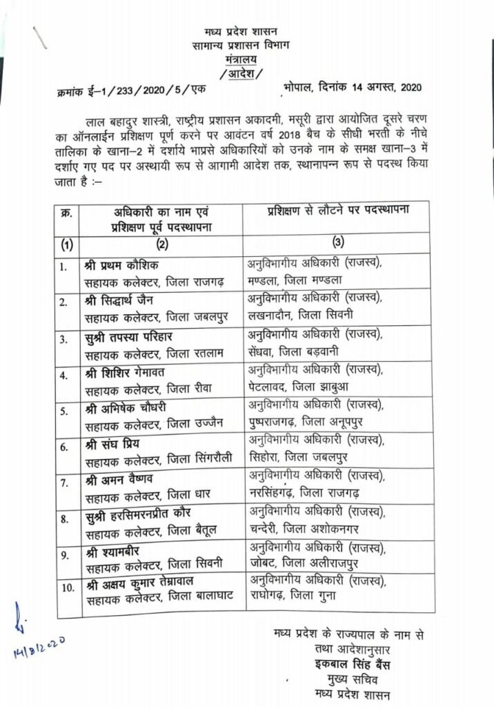 वहीं हरसिमरन कोर को एसडीएम, चंदेरी और अक्षय कुमार को एसडीएम, राघोगढ़ शिशिर गेमावत, एसडीएम पेटलावद, अभिषेक चौधरी, एसडीएम पुष्पराजगढ़, संघ प्रिय, एसडीएम सीहोर, अमन वैष्णव, एसडीएम नरसिंहगढ़ बनाया गया है।