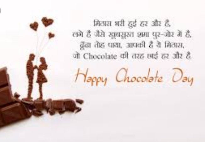 राष्ट्र आजकल प्रतिनिधि। वैलेंटाइन सप्ताह की शुरुआत रोज डे से होती है। इसके बाद एक के बाद एक 14 फरवरी तक रोजाना हर दिन खास होता है। प्यार के इस खास सप्ताह के तीसरे दिन चॉकलेट डे होता है। प्रेम में मिठास होना जरूरी होता है। रिश्ते में मिठास लाने के लिए एक दूसरे का मुंह मीठा करना चाहिए। ऐसे में वैलेंटाइन सप्ताह में प्यार में मिठास बढ़ाने के लिए चॉकलेट डे का भी खास महत्व है। अगर आप भी अपने जीवन मे मिठास लाना चाहते हैं तो पार्टनर को चॉकलेट गिफ्ट में दे सकते हैं। चॉकलेट के साथ अपने इश्क का इजहार करें। इस वैलेंटाइन सप्ताह में चॉकलेट डे के मौके पर अपने पार्टनर, दोस्तों और करीबियों को रिश्ते में मिठास घोलने वाले आकर्षक वॉलपेपर के जरिए शुभकामना सन्देश भेज सकते हैं।