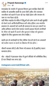 मानव अधिकार आयोग के सदस्य प्रियंक कानूनगो ने भी सोशल मीडिया पर उक्त वीडियो साझा करते हुए संबंधित युवकों के खिलाफ कार्रवाई की मांग की है। वहीं शहर के कई हिंदू संगठनों के लोगों ने भी वीडियो शेयर कर आरोपित युवकों पर कार्रवाई की मांग उठाई है।
